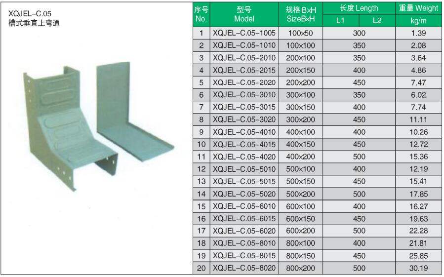 XQJEL_C.05槽式垂直上彎通產(chǎn)品型號(hào)、規(guī)格、重量等參數(shù)及XQJEL_C槽式電纜橋架在不同跨距下允許均布載荷變形量。