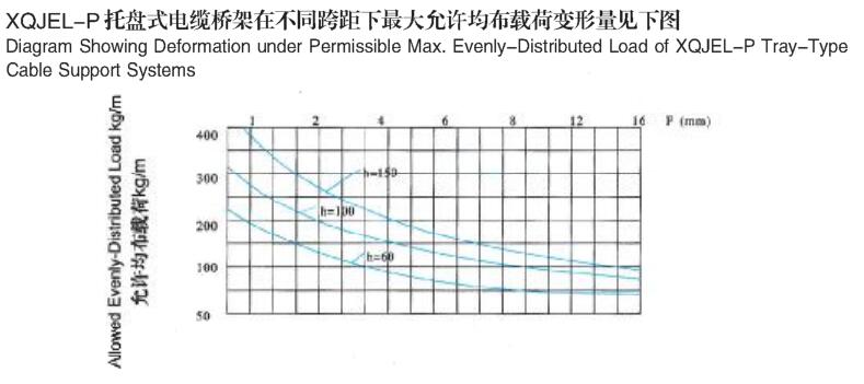XQJEL_P.01托盤式直通產(chǎn)品型號(hào)、規(guī)格、重量等參數(shù)及XQJEL_P托盤式電纜橋架在不同跨距下允許均布載荷變形量。