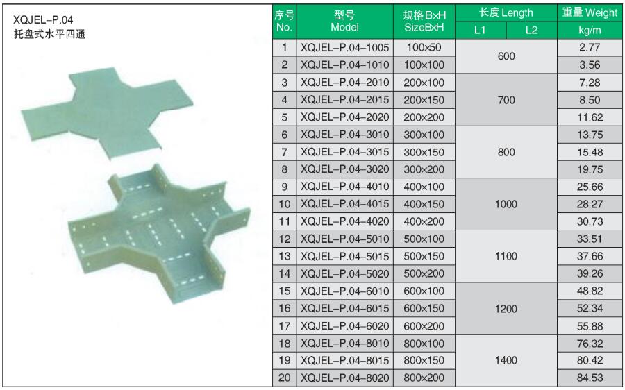 XQJEL_P.04托盤式四通產品型號、規(guī)格、重量等參數及XQJEL_P托盤式電纜橋架在不同跨距下允許均布載荷變形量。