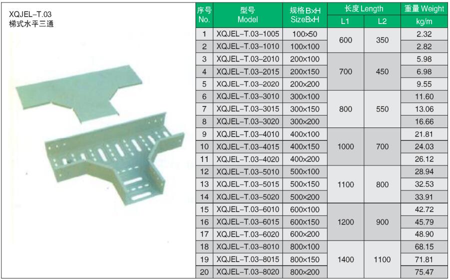 XQJEL_T.03梯式三通產(chǎn)品型號(hào)、規(guī)格、重量等參數(shù)及XQJEL_T梯式電纜橋架在不同跨距下允許均布載荷變形量。
