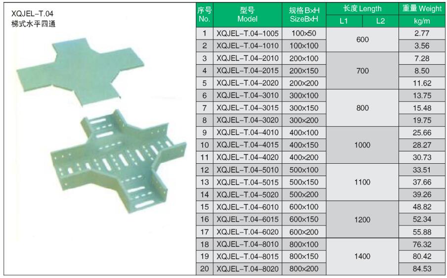 XQJEL_T.04梯式四通產(chǎn)品型號、規(guī)格、重量等參數(shù)及XQJEL_T梯式電纜橋架在不同跨距下允許均布載荷變形量。