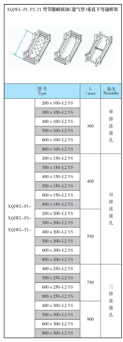 XQJWL-P1、P2、T1型節(jié)能耐腐蝕(透氣型)垂直下彎通橋架型號參數(shù):